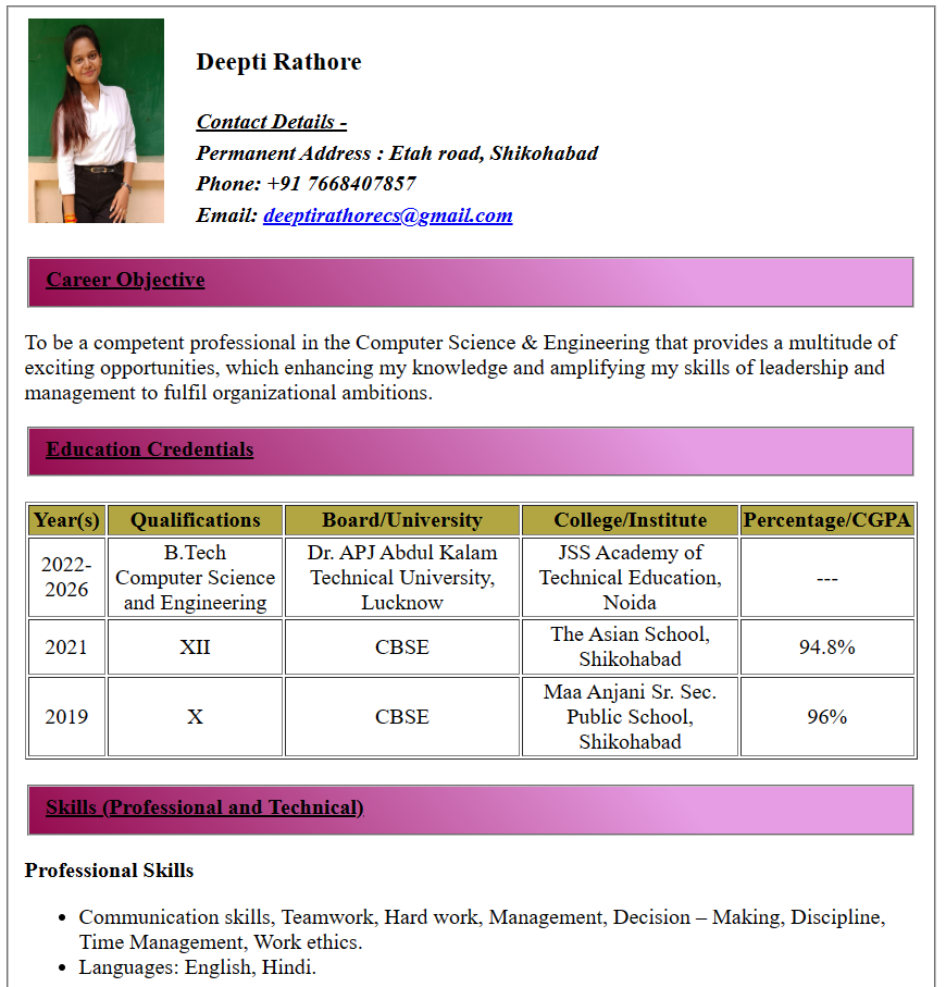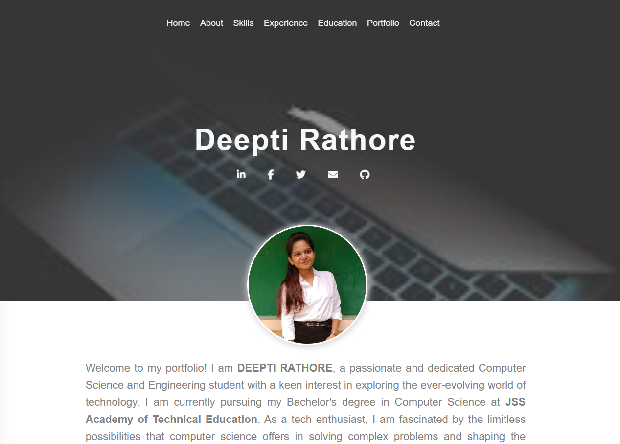 Welcome to my portfolio! I am DEEPTI RATHORE, a passionate and dedicated Computer Science and Engineering student with a keen interest in exploring the ever-evolving world of technology. I am currently pursuing my Bachelor's degree in Computer Science at JSS Academy of Technical Education. As a tech enthusiast, I am fascinated by the limitless possibilities that computer science offers in solving complex problems and shaping the future. My areas of interest include Web Development, Data Structure and Algorithm , and I am continuously expanding myknowledge in these domains through personal projects and coursework. In addition to my technical skills, I am also committed to effective communication and leadership. I have experience working in diverse teams, where I have not only contributed to the technical aspects but also played a role in fostering a positive and collaborative work environment.